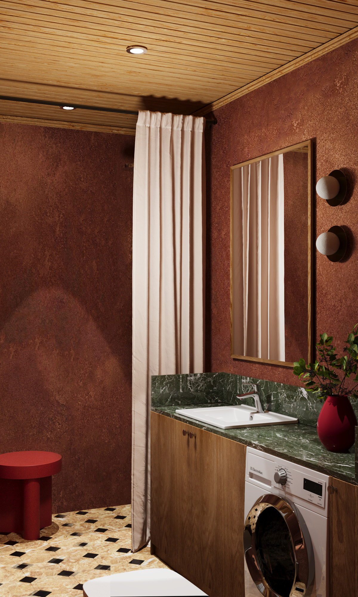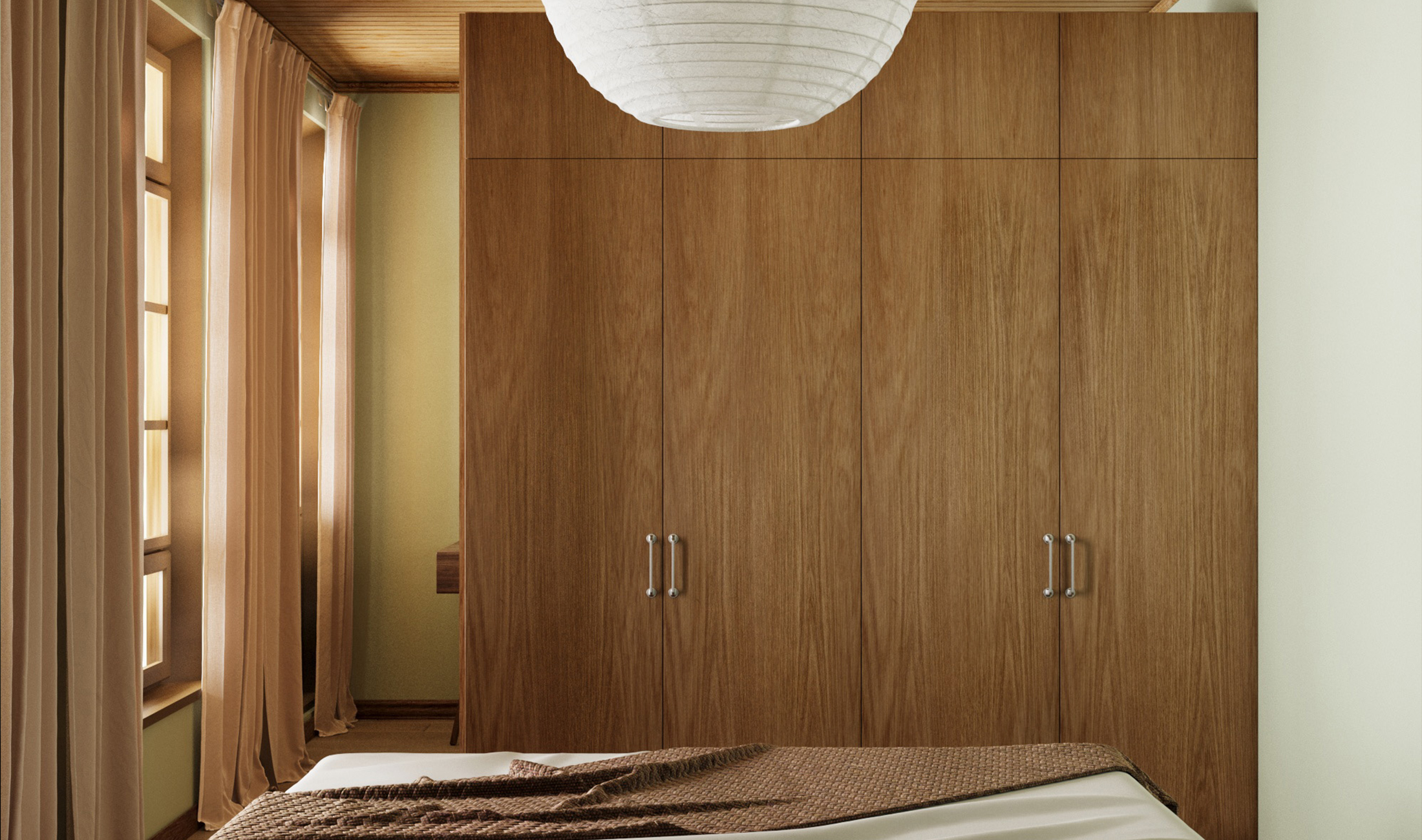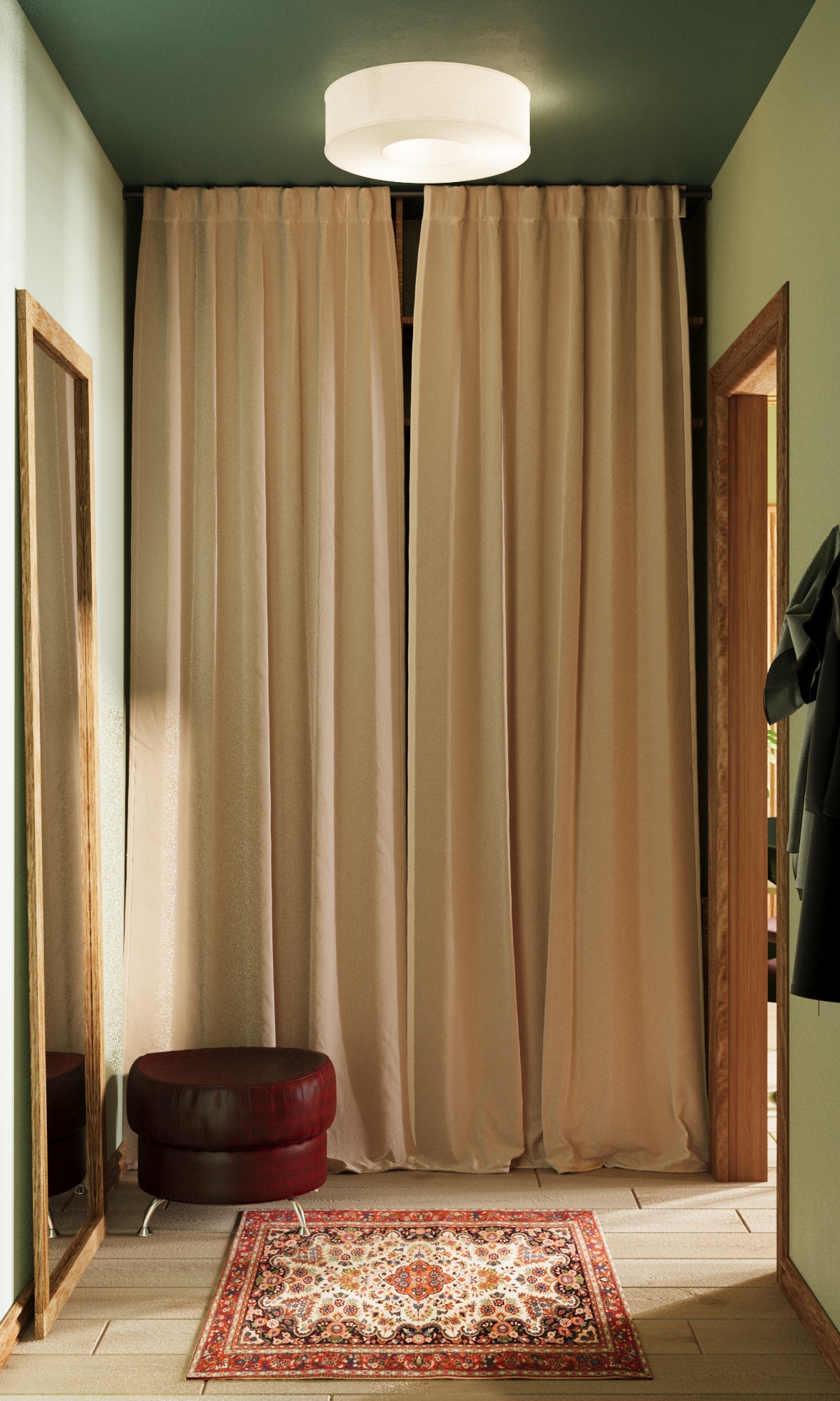 Spinta holo erdvėje, dengiama ne tradiciniais fasadais, bet užuolaidomis. Toks sprendimas erdvei suteikia jaukumo, bei lengvumo.
