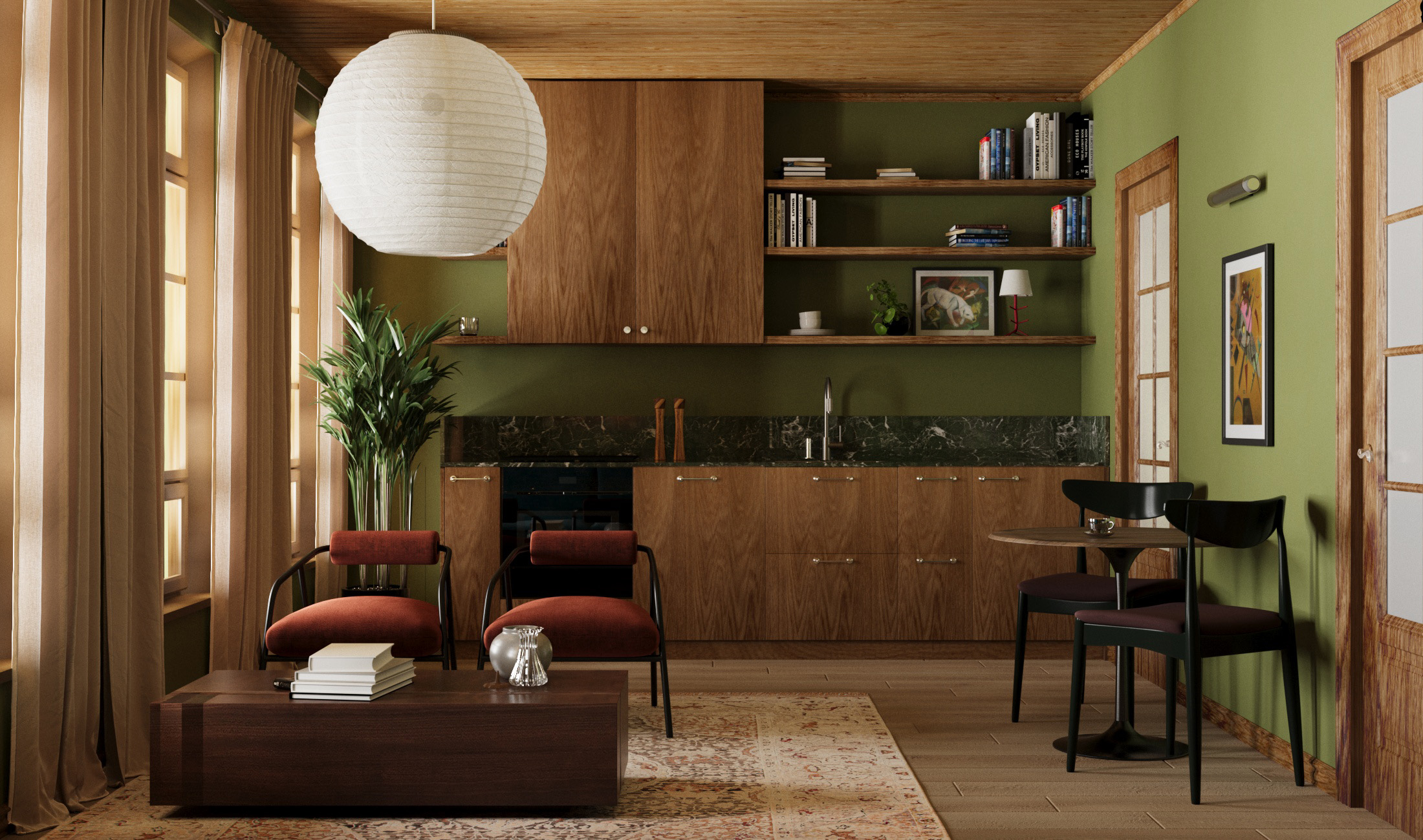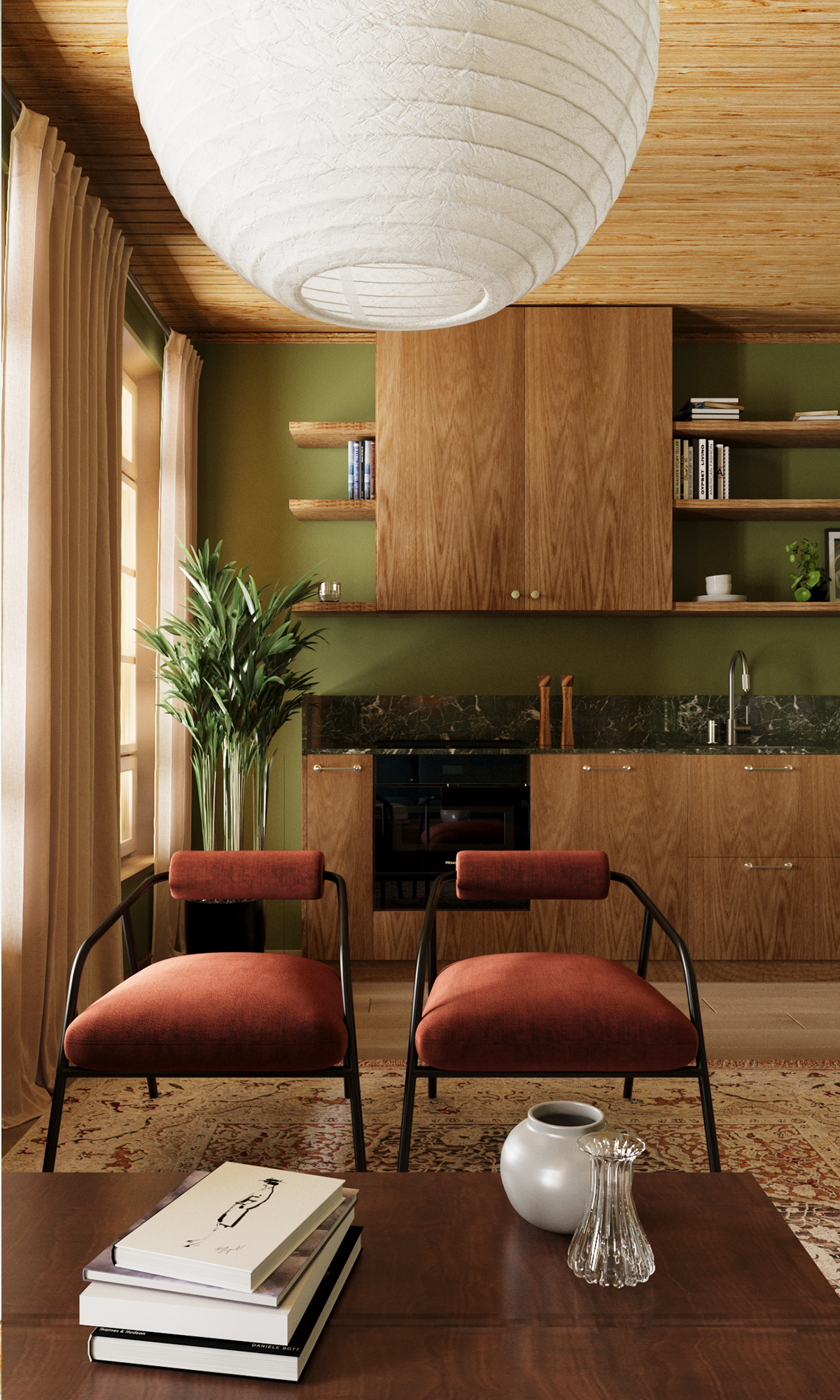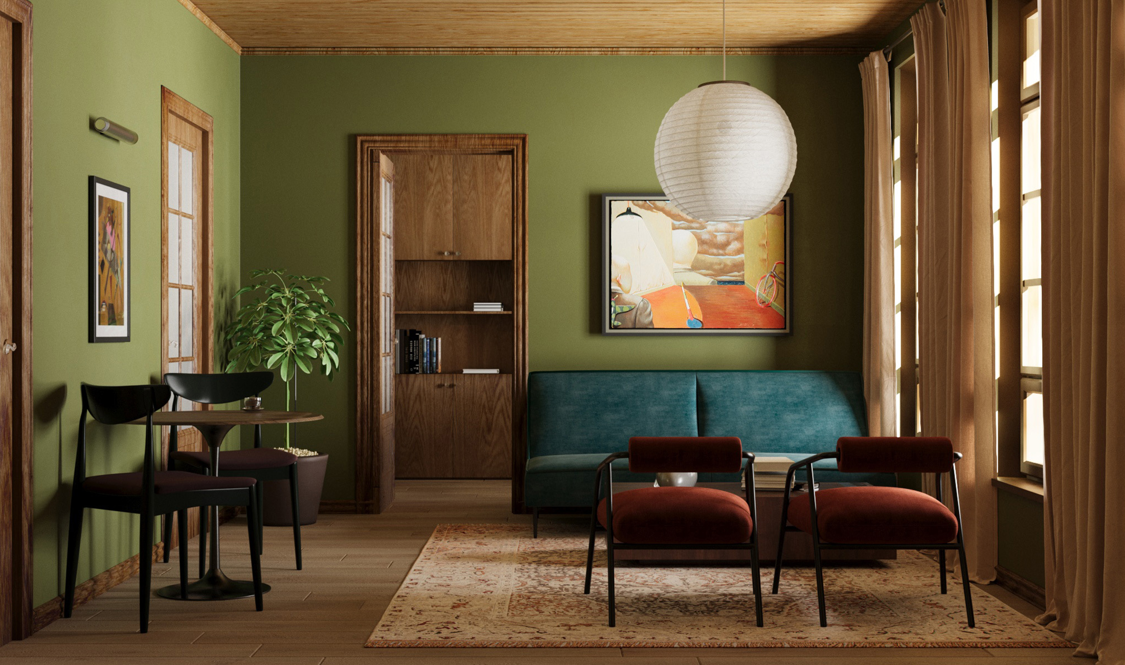 Interjero projektas senos statybos name. Šio projekto pagrindinė užduotis buvo išlaikyti vertinguosius būsto elementus. Išsaugoti esami mediniai langai bei lubos, kurie projektui suteikia autentiškumo. Šie elementai dar labiau išryškėja žaliame fone. Spalvingi, minkšti baldai bei paveikslai suteikia interjerui šiuolaikiškumo ir žaismingumo.