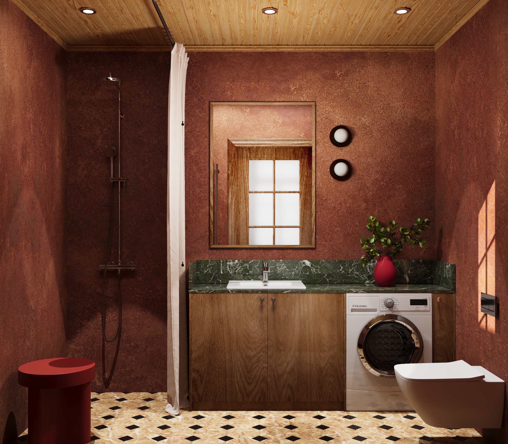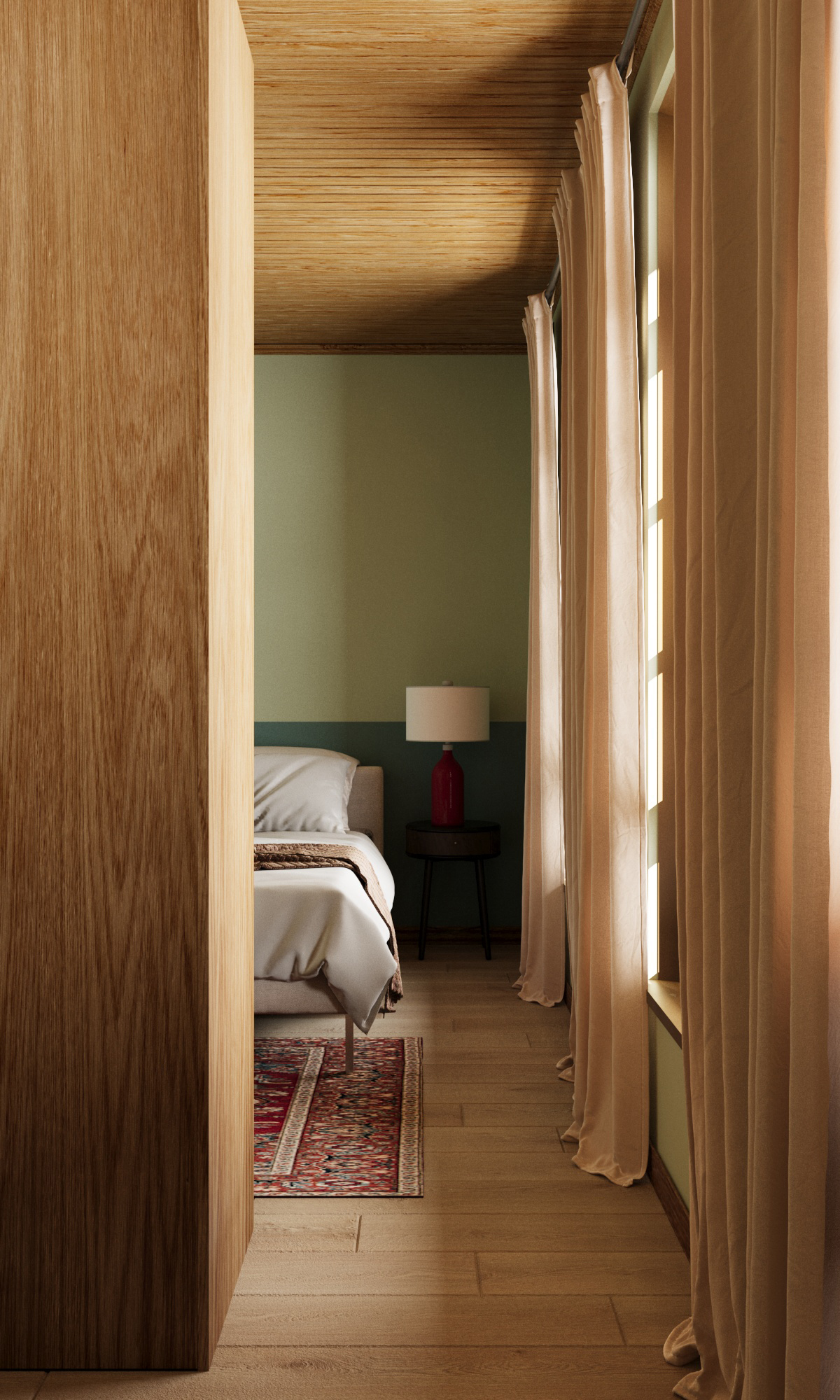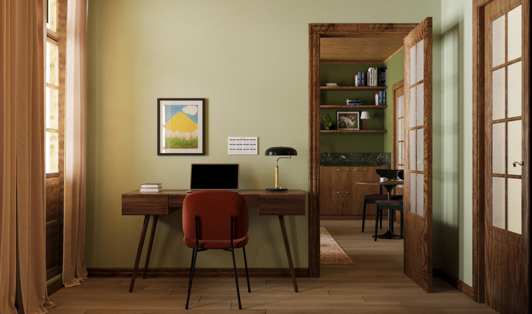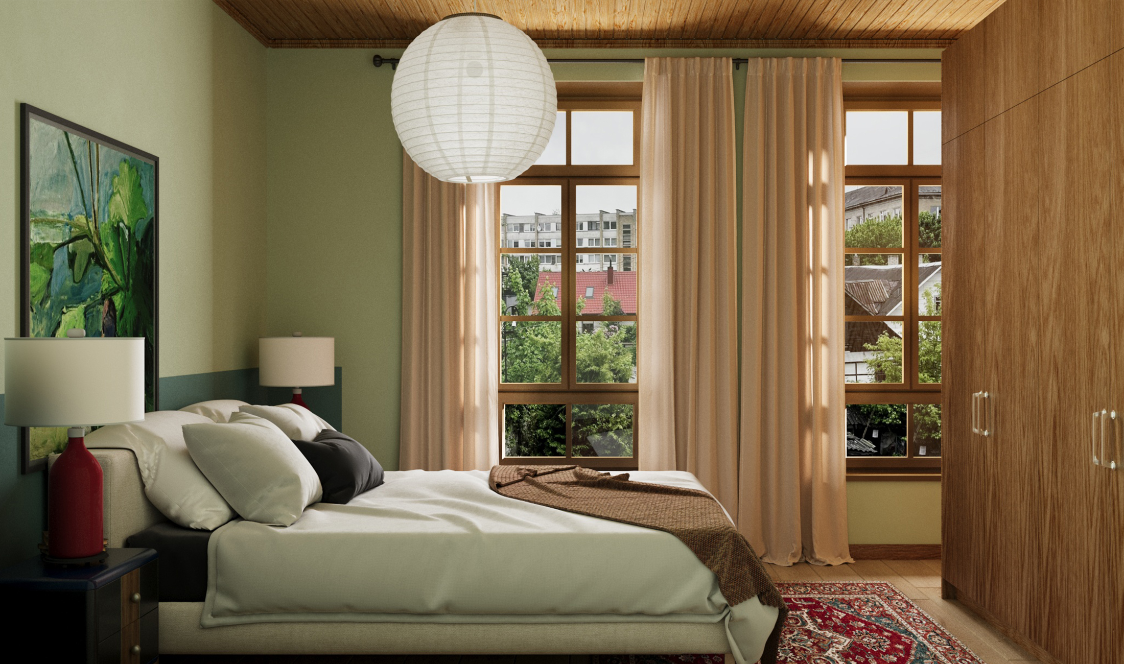 Interjero projektas senos statybos name. Šio projekto pagrindinė užduotis buvo išlaikyti vertinguosius būsto elementus. Išsaugoti esami mediniai langai bei lubos, kurie projektui suteikia autentiškumo. Šie elementai dar labiau išryškėja žaliame fone. Spalvingi, minkšti baldai bei paveikslai suteikia interjerui šiuolaikiškumo ir žaismingumo.