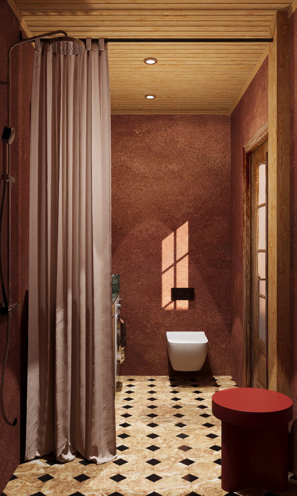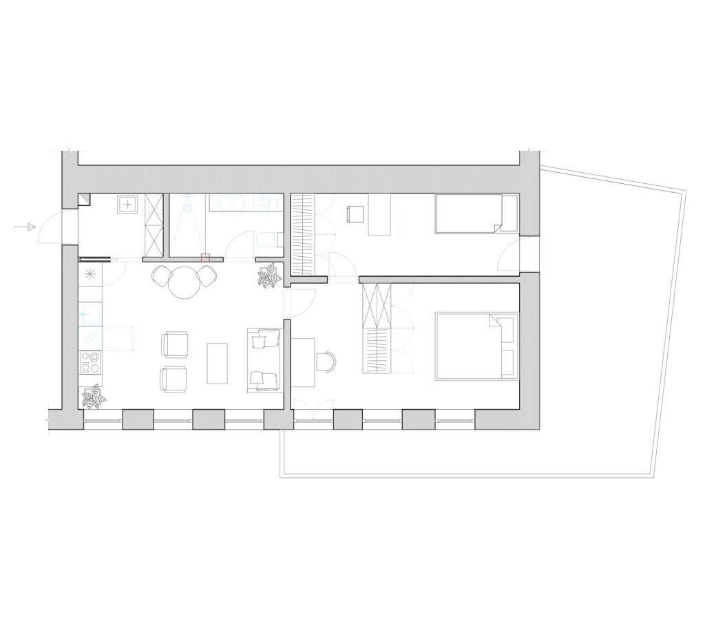 Projektuojant interjerą senos statybos name funkcija buvo sprendžiama prisitaikant prie dalinai laikančiųjų sienų. Todėl darbo erdvė suprojektuota su išėjimu į terasą taip išlaikant du privačius miegamuosius kambarius.