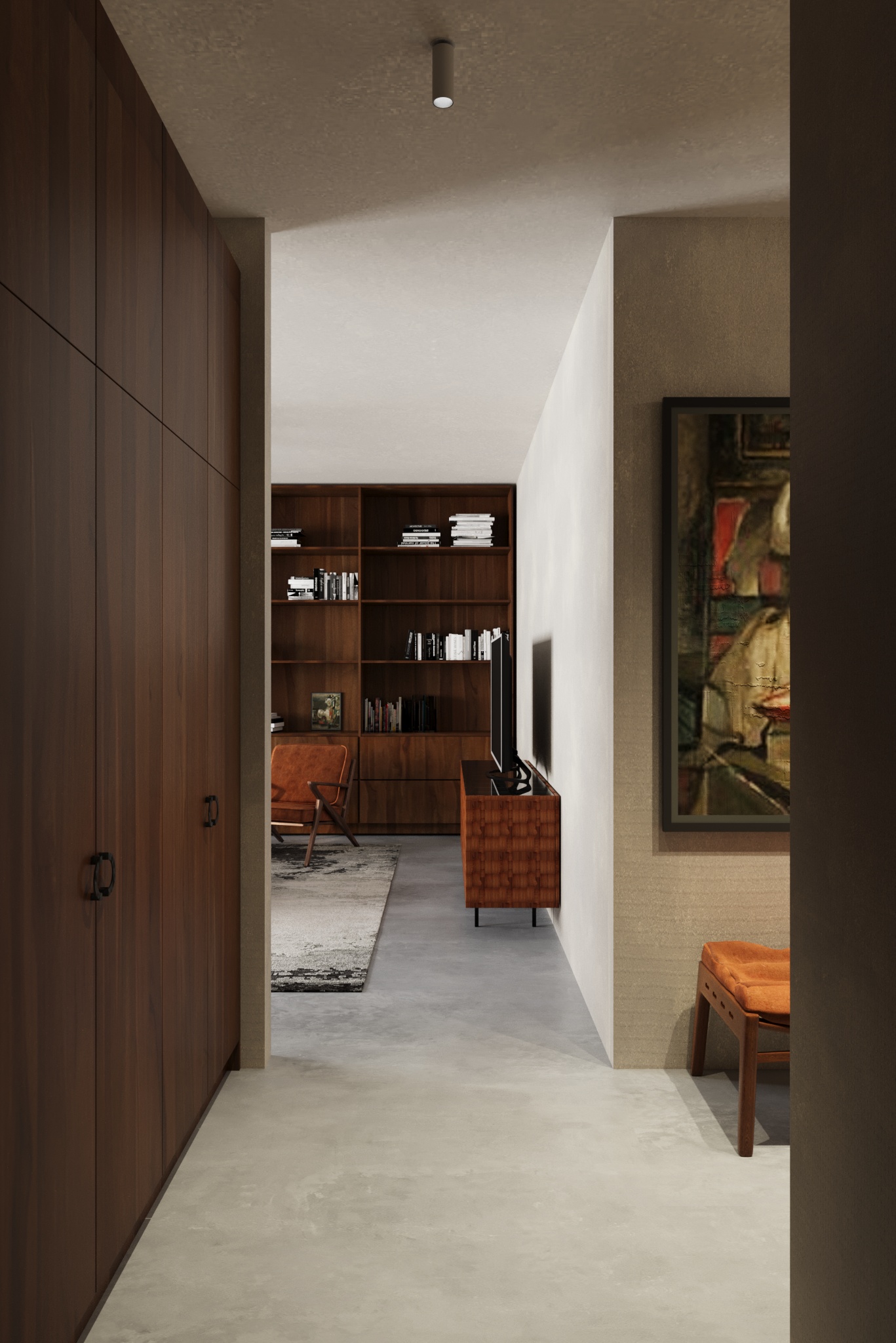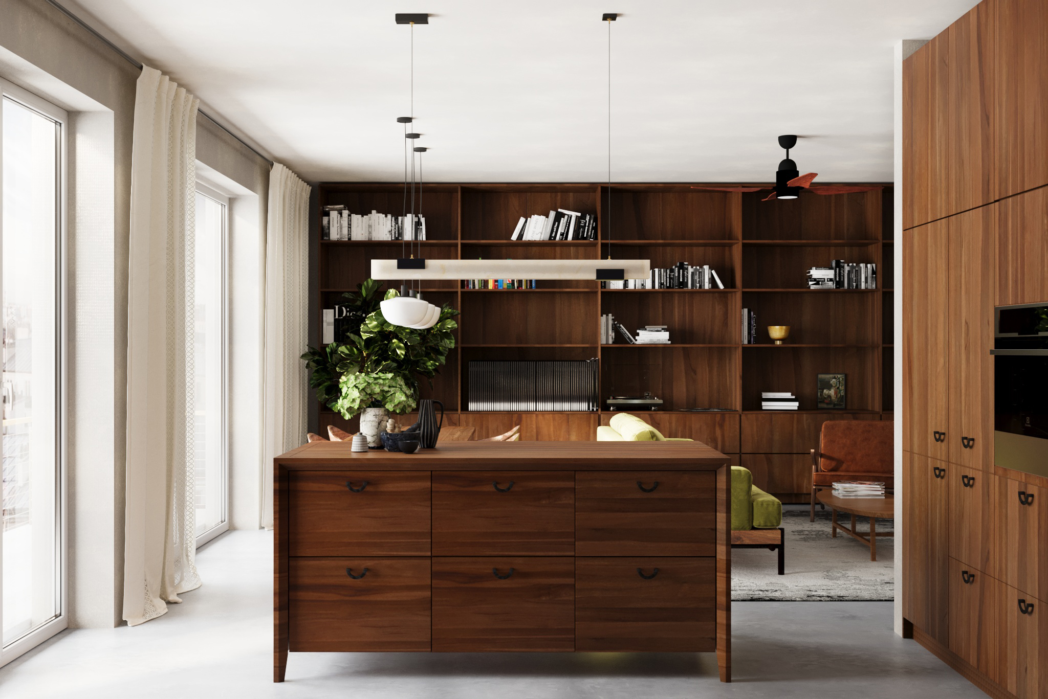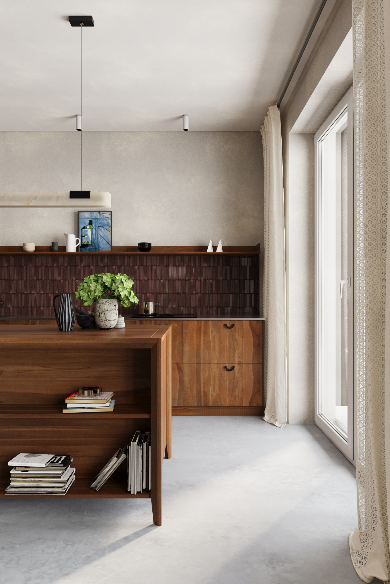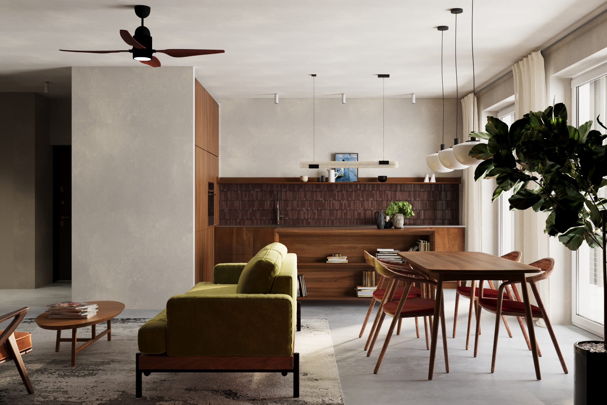Pasirinktos ilgaamžės lieto betono grindys, riešutmedžio baldai, natūrali molio tinko sienų apdaila. Interjerą vienija ir sušildo ryškūs natūralaus riešutmedžio baldai. Akcentu tampa samanų spalvos sofa bei augalai.