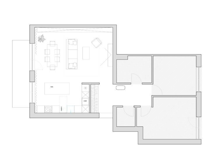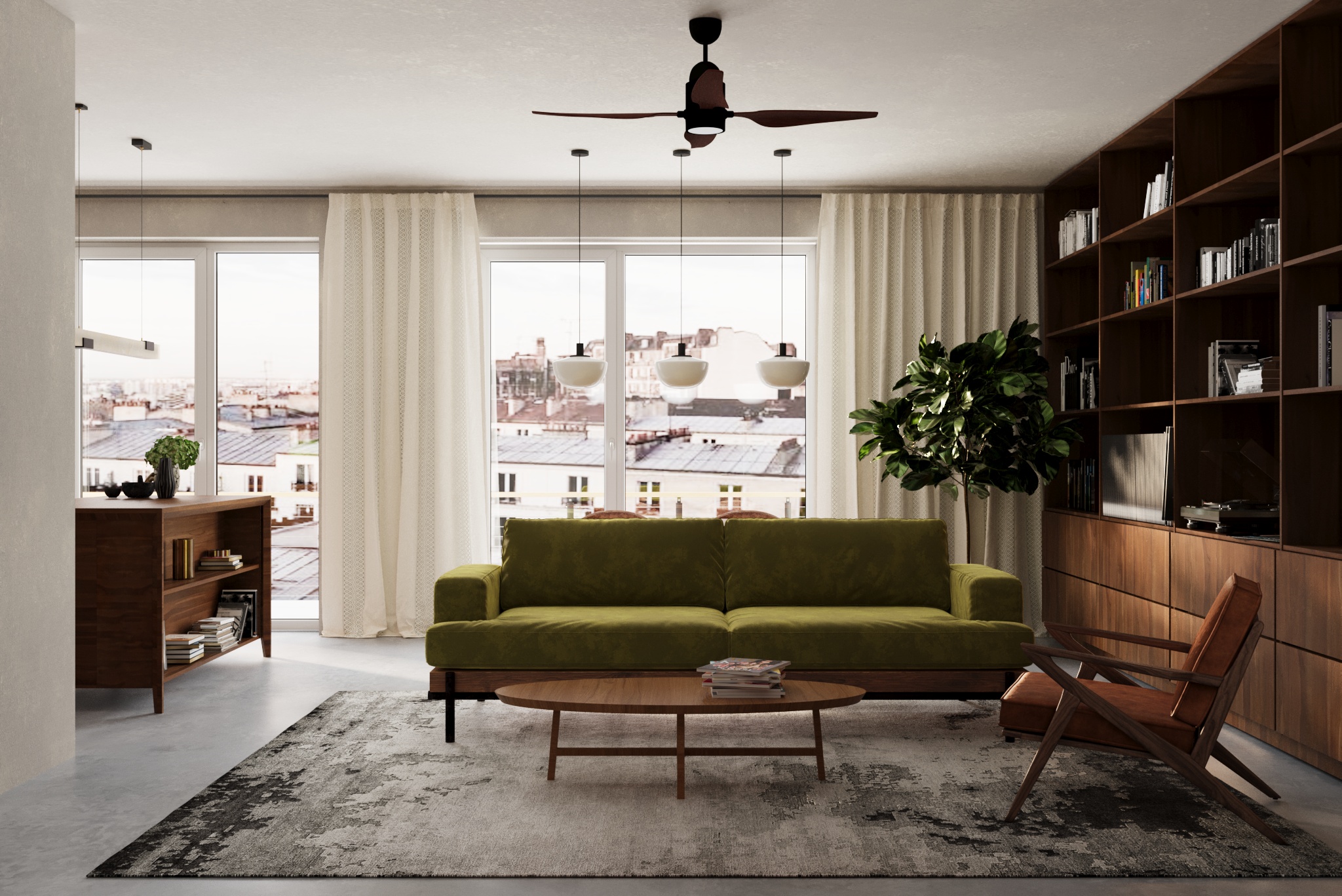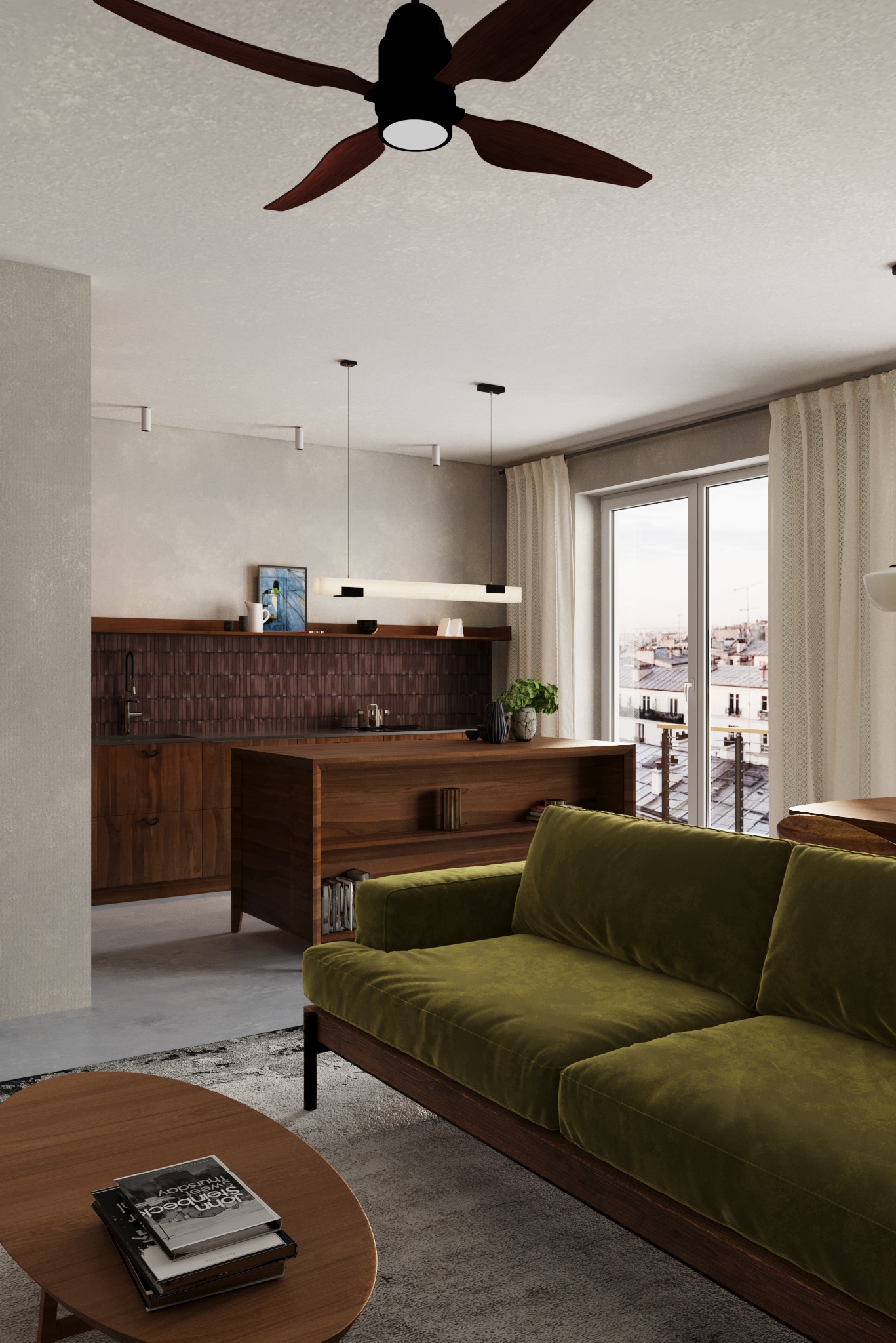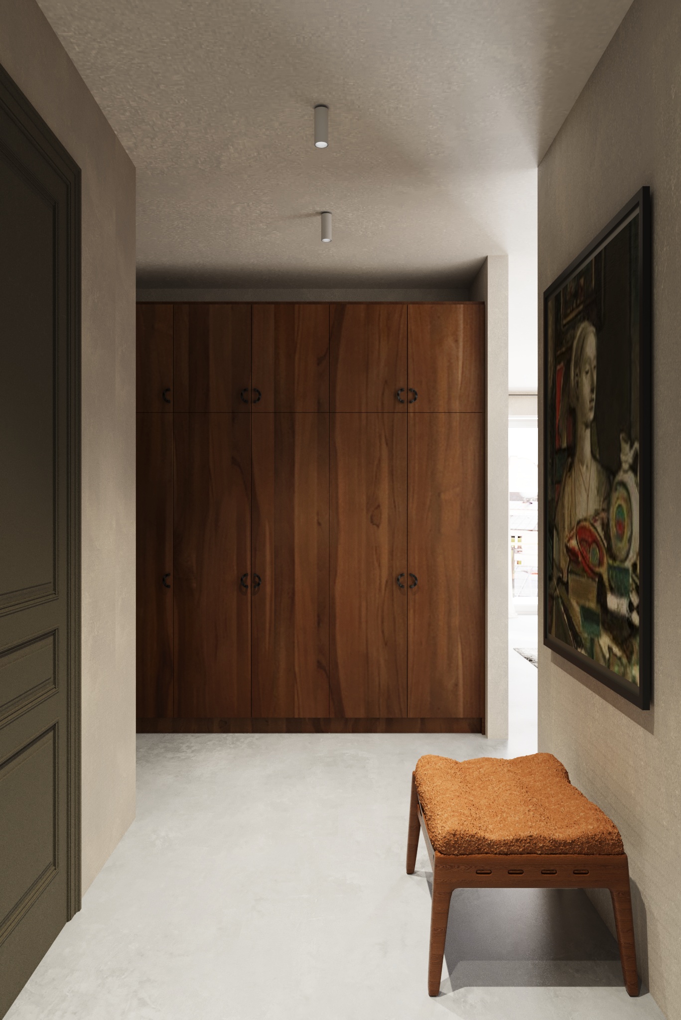 Pasirinktos ilgaamžės lieto betono grindys, riešutmedžio baldai, natūrali molio tinko sienų apdaila. Interjerą vienija ir sušildo ryškūs natūralaus riešutmedžio baldai. Akcentu tampa samanų spalvos sofa bei augalai.